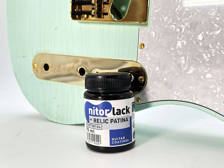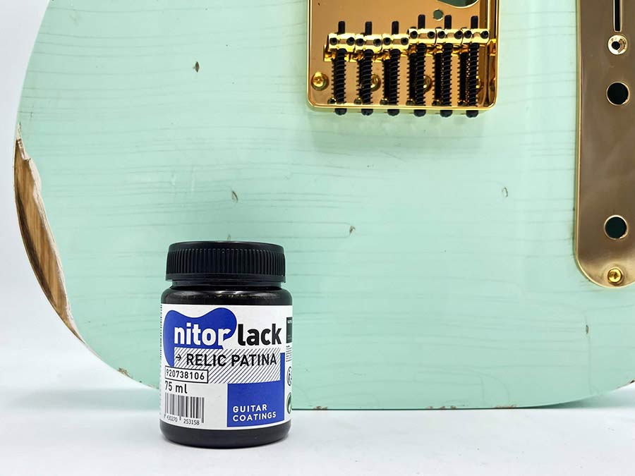 If you are looking to turn your guitar into an authentic vintage guitar, Nitorlack Relic Patina is the perfect solution. By applying this product to a cracked or dented guitar, you will achieve an aged appearance by filling in and highlighting these flaws. If your guitar has parts of the wood with hardly any lacquer/finish left, you will be able to darken it without any difficulty and achieve the desired vintage look. Therefore, you can easily make your guitar look like it has been played for years.