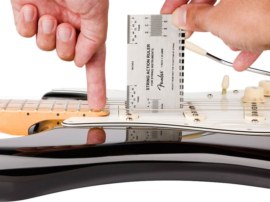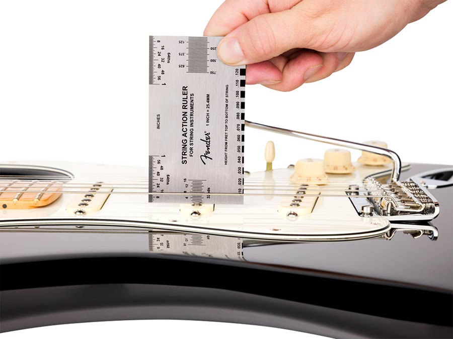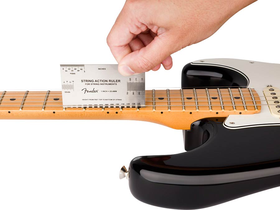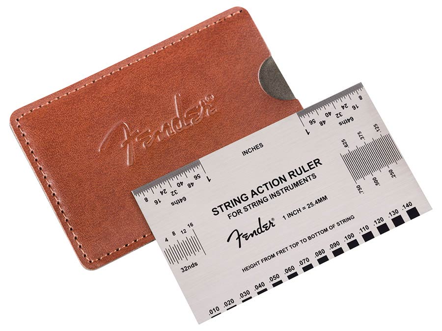 Built-in reference guide: Displays Fender's factory-recommended string action specifications for electric guitars, acoustic guitars, and bass guitars.