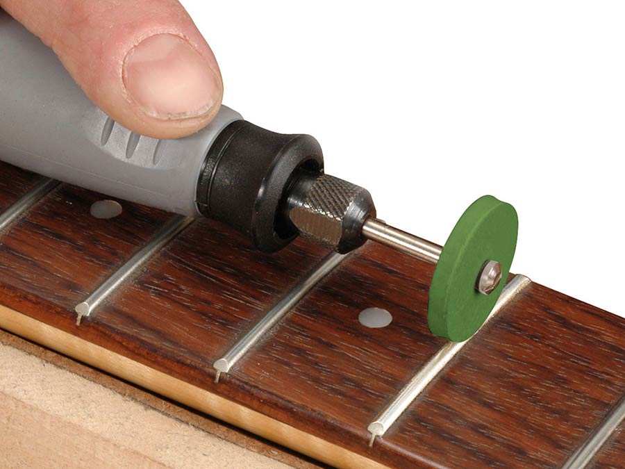Mount the wheel and mandrel in your Dremel or Foredom handpiece. Lightly groove the edge of the wheel with a small round file. The slim handpiece makes it easy to hold the grooved wheel on a crowned fret, to gently polish it to a smooth shine.