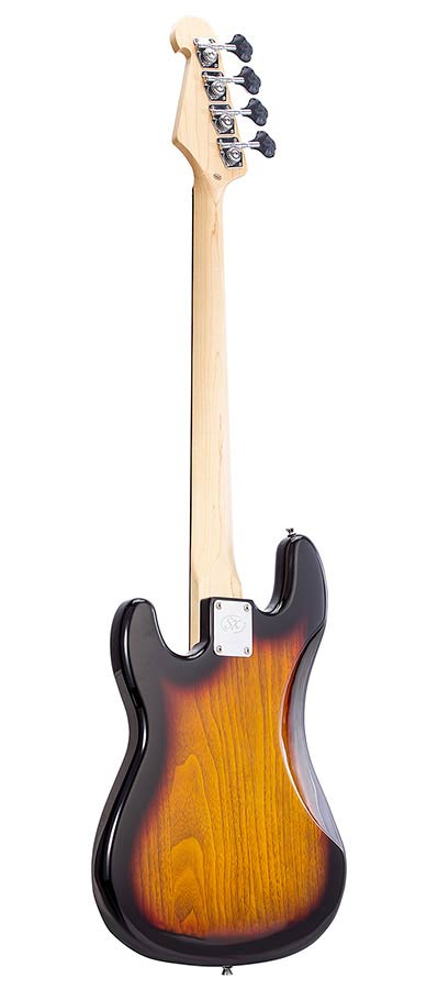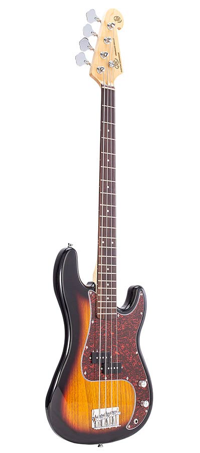 P-style electric bass guitar, 3 tone sunburst, with gig bag