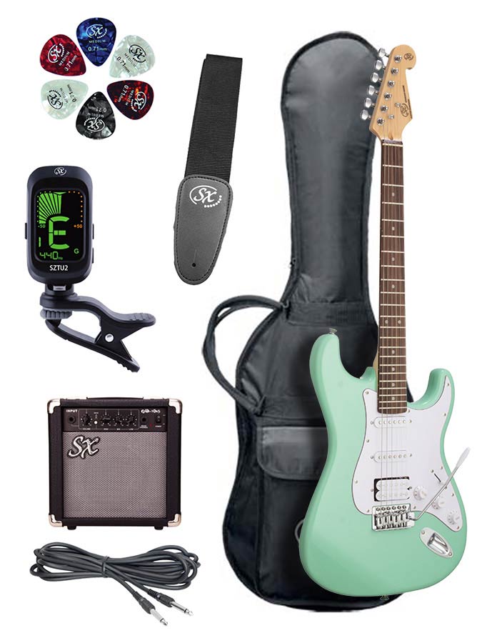 ST style electric guitar pack, HSS pickups, 10W amp, bag, tuner, strap, cable & 6 picks, surf green