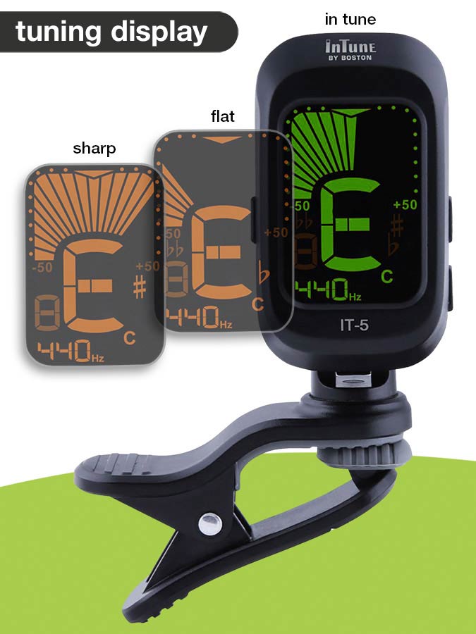 The Boston IT-5 is a very straightforward and affordable clip-on tuner which automaticly turns on when clipped on to the headstock and turns off when not used,