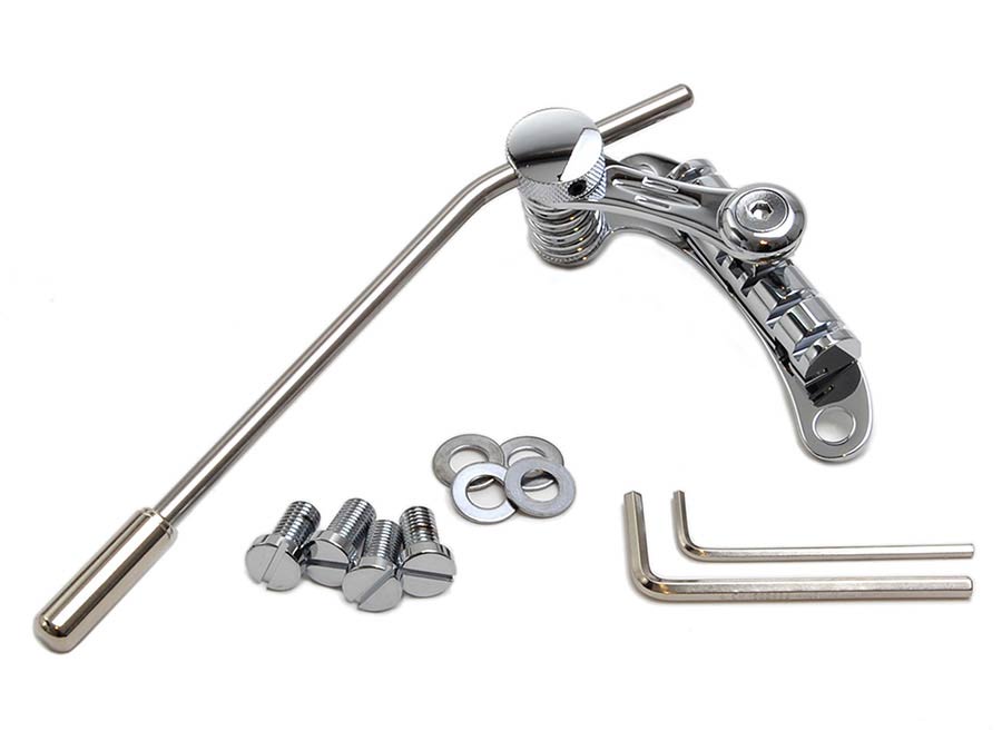 Licensed by Duesenberg - Can simply be swapped for a stop tailpiece. No drilling, no milling necessary. The tremolo is attached to the two threaded tailpiece bushings with the supplied screws. The round arm can be adjusted in angle and length to easily find the preferred personal setting. Incl. metric and US screws, matching hex keys and an 8mm open-end wrench for the tremolo arm nut. The distance between the tailpiece studs should be 81.5 mm, measured from center to center.