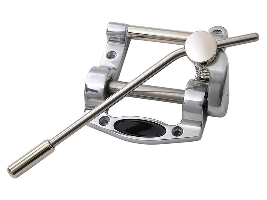 Inspired by the Duesenberg Diamond Deluxe Tremola. Identical in function and material quality! An aluminium frame ensures excellent transmission of the resonances, high-quality bearings allow the well-known smooth tremolo action and ensure optimum tuning stability. The 360° rotatable round arm can be adjusted in length, response, position and movement. Easy string change due to holes in the axis. As easy as stringing a stop tailpiece guitar. Simply the best!