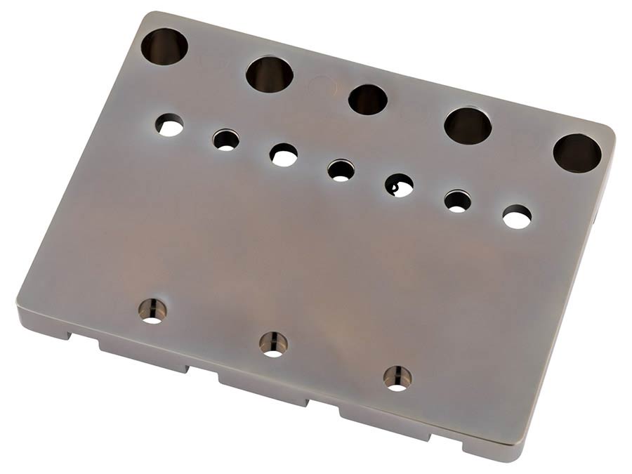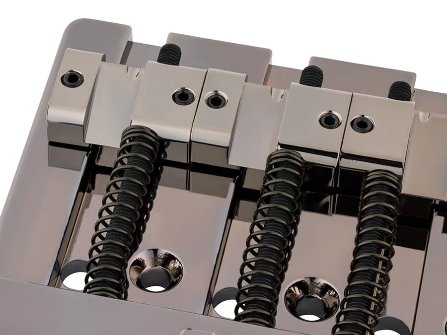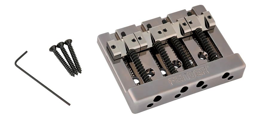 Introduced on the American Ultra II bass guitars, the precision manufactured HiMass™ bridge allows string-through or top-load operation for greater versatility with endless sustain, precise attack and rock-solid tuning stability. The brass baseplate and machined saddles impart warm, authentic vintage-style tone with .775" string spacing for a familiar playing feel. Precision engineered as a direct drop-in replacement for modern-style Fender models; this bridge mounts via three screws.