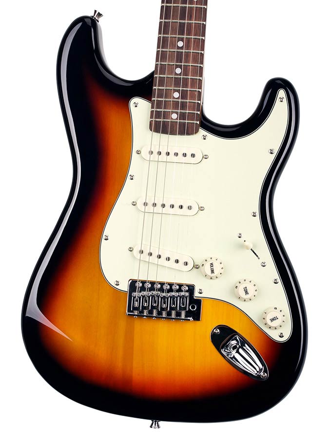 elektrische gitaar 3/4, met 3 single coil pickups en vintage tremolo, tas, sunburst. 61 cm mensuur