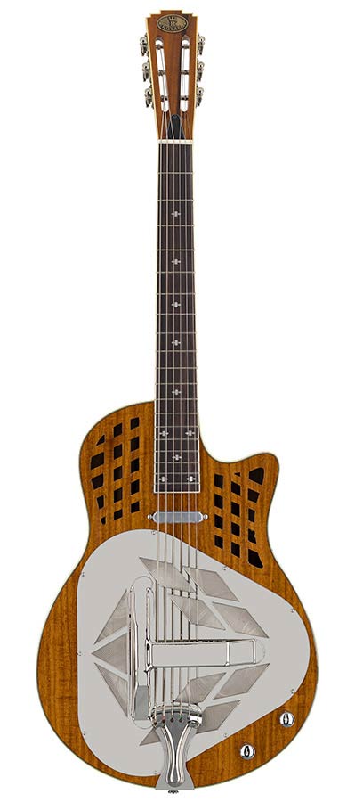 Koa body tricone resonator guitar, 12 fret, Lipstic single coil Pickup, Volume & Tone Control, with cutaway.