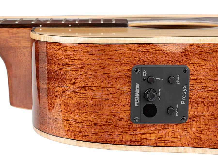 dreadnought guitar, solid spruce top, cutaway, preamp, flamed maple & abalone, natural gloss