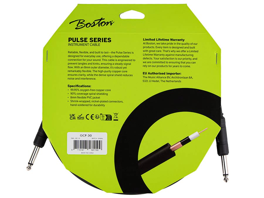 The Boston Pulse Series Instrument Cable is built for musicians who value reliability, flexibility, and consistent performance. Designed for everyday use, it combines a high-purity oxygen-free copper core with a dense spiral shield to deliver a clear signal with reduced noise and interference. Its remarkably flexible construction helps prevent tangles and kinks, while the robust 8 mm PVC jacket offers durability without stiffness. Finished with hand-soldered, nickel-plated connectors, the Boston Pulse Series Instrument Cable provides a solid, trustworthy connection for practice rooms, stages, and studios alike.