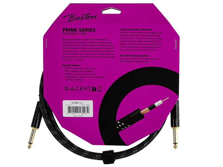 The Boston Prime Series Instrument Cable is designed for players who want dependable performance with a distinctive look. Built around a high-purity oxygen-free copper core, this cable delivers a clear, rich signal with minimal interference, whether on stage or in the studio. The flexible spiral shielding keeps noise under control and is designed to prevent tangles and kinks, while the woven tweed jacket adds durability and a classic vibe. Finished with gold-plated, hand-soldered connectors, the Boston Prime Series Instrument Cable is made to perform reliably, night after night.