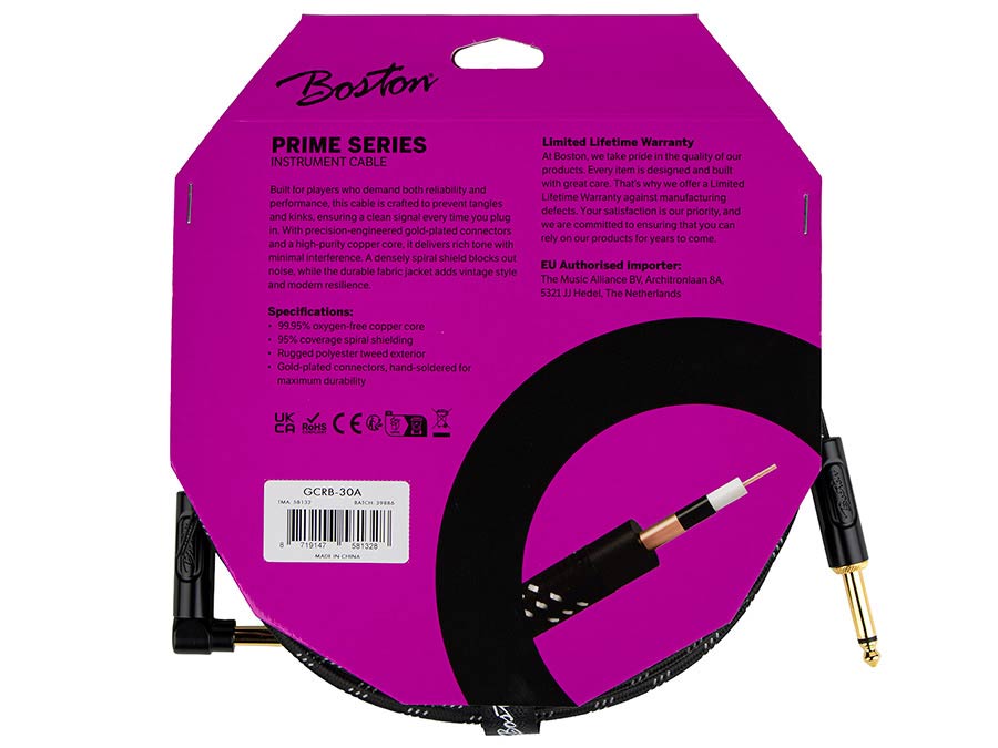 The Boston Prime Series Instrument Cable is designed for players who want dependable performance with a distinctive look. Built around a high-purity oxygen-free copper core, this cable delivers a clear, rich signal with minimal interference, whether on stage or in the studio. The flexible spiral shielding keeps noise under control and is designed to prevent tangles and kinks, while the woven tweed jacket adds durability and a classic vibe. Finished with gold-plated, hand-soldered connectors, the Boston Prime Series Instrument Cable is made to perform reliably, night after night.