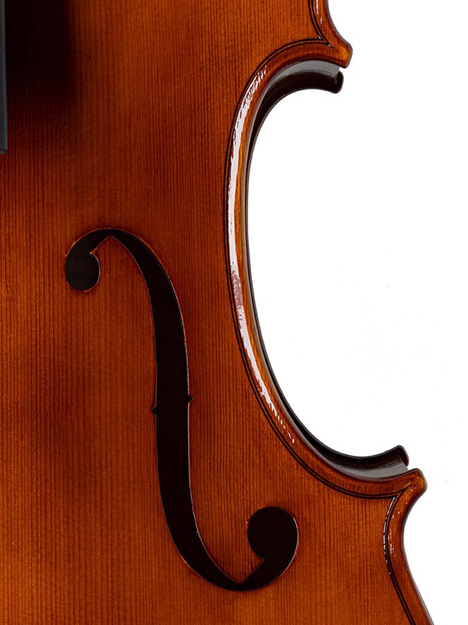 Special attention is given to the graduation of the top and back plates, allowing for optimal tonal balance and responsiveness. The instrument is delivered without setup, and comes fitted with high-quality Teller ebony pegs.