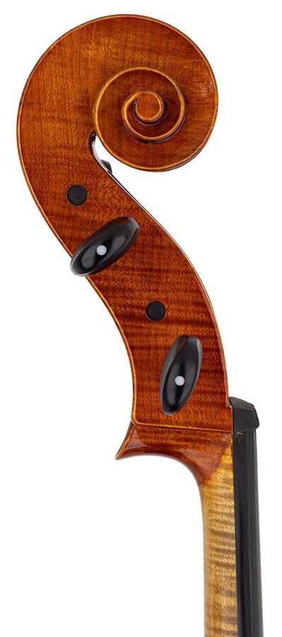 It features an exceptionally flamed maple back, sides, and neck, finished with a highly transparent oil varnish that reveals every detail of the wood’s natural beauty. The top is finely carved and carefully graduated to bring out a rich, balanced sound with excellent projection and nuance.