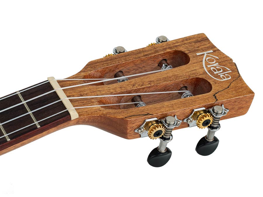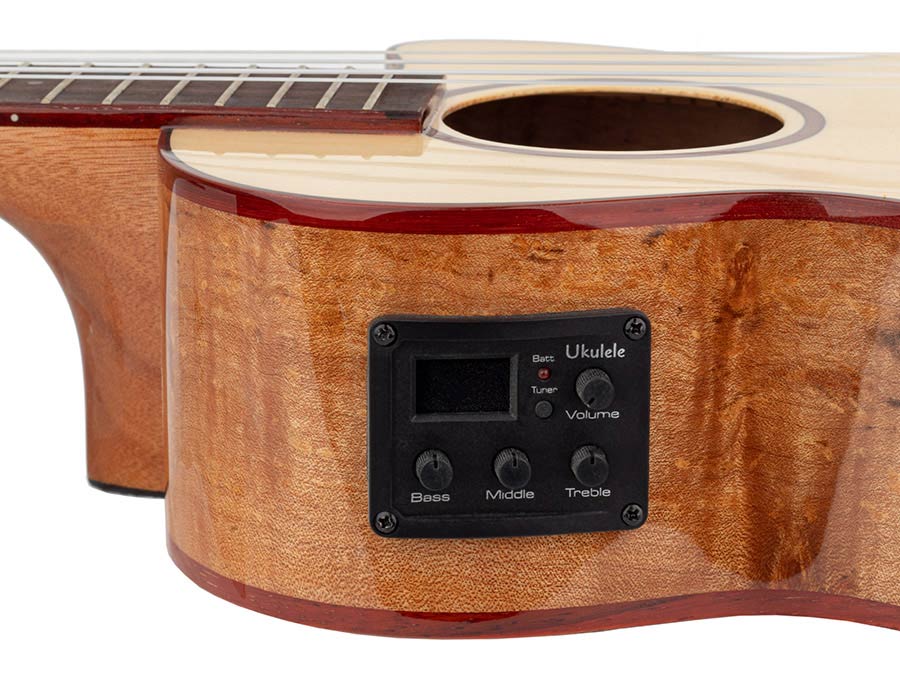The solid spruce top provides a rich, warm sound with beautiful clarity, while the spalted maple sides and back give the ukulele a striking visual appeal and contribute to its refined, resonant tone. The elegant maple binding adds a polished finish, and the high-gloss finish enhances its luxurious look.